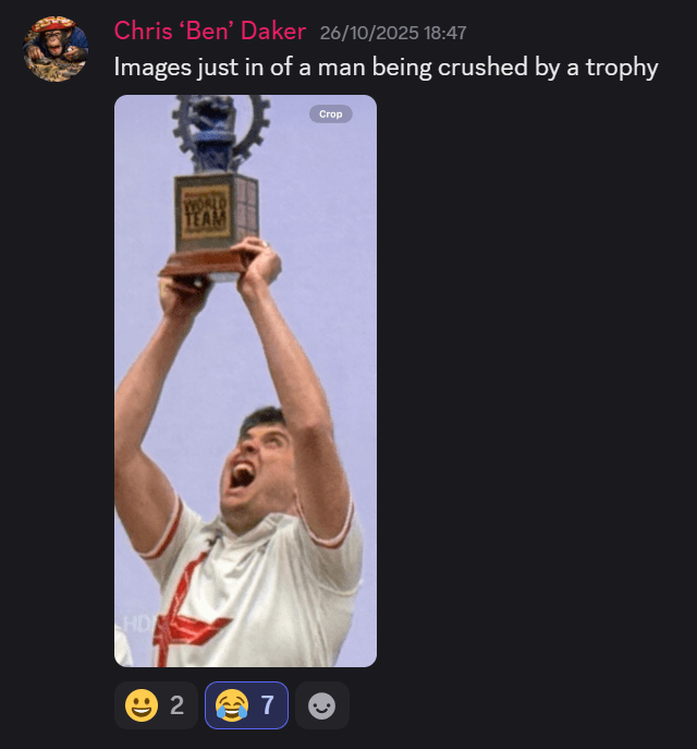 Back home, and with the other English teams, the reaction was similarly overjoyed. And of course, not without our typical brand of humour.